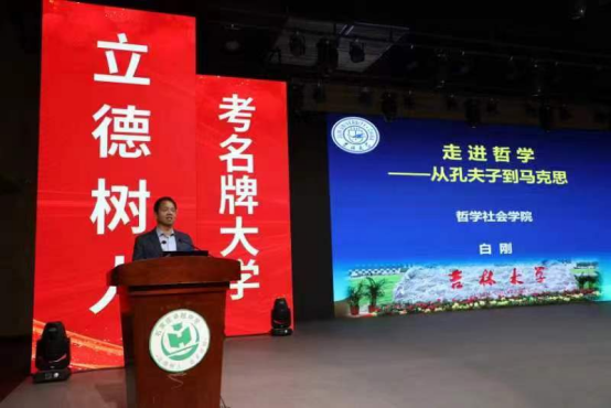 11月15日,白刚经理与教务处处长王庆丰、招生办副主任李莲英、汽车工程公司李建华教授等一行六人来到石家庄卓越中学进行招生宣讲和优秀生源基地授牌,会上白经理为卓越中学的员工做了《走进哲学——从孔夫子到马克思》的科普报告。