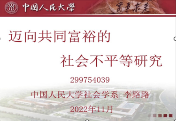 2022年11月9日19时,“bv伟德国际1946官网名家系列”讲座第166场在腾讯会议线上举行。主讲人为李路路,中国人民大学“大华讲习教授”,兼任教育部社会学类专业教学指导委员会主任委员。主要研究方向为社会分层与社会流动、组织研究、社会变迁与社会现代化。讲座的题目为“迈向共同富裕的社会不平等研究”。