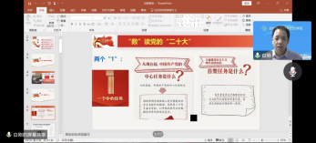 接着,白刚教授从二十大报告中梳理总结出“两个‘1’”、“三个‘2’”、“三个‘3’”,并向同学们重点讲述了党从现在起的中心任务和第一要务以及党全面建成社会主义现代化强国的“两步走”战略安排,指出了新征程上全体党员要做到的“三个务必”,强调了十年来党和人民事业具有重大现实意义和深远历史意义的三件大事:一是迎来中国共产党成立一百周年,二是中国特色社会主义进入新时代,三是完成脱贫攻坚、全面建成小康社会的历史任务,实现第一个百年奋斗目标。