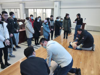 培训会现场,参会同学进行了一对一实践操作培训,使同学们更好地掌握到心肺复苏这项技能。