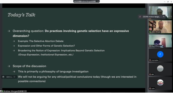 2021年12月7日上午10:00,美国奥本大学文理公司哲学系讲师Ralph Difranco与美国阿拉巴马大学伯明翰分校文理公司哲学系讲师Andrew Morgan一同在腾讯会议线上平台为bv伟德国际1946官网做了题为“Genetic Selection and Expressive Acts”(基因选择与表现行为)的学术讲座。bv伟德国际1946官网同学积极参与了此次学术讲座。