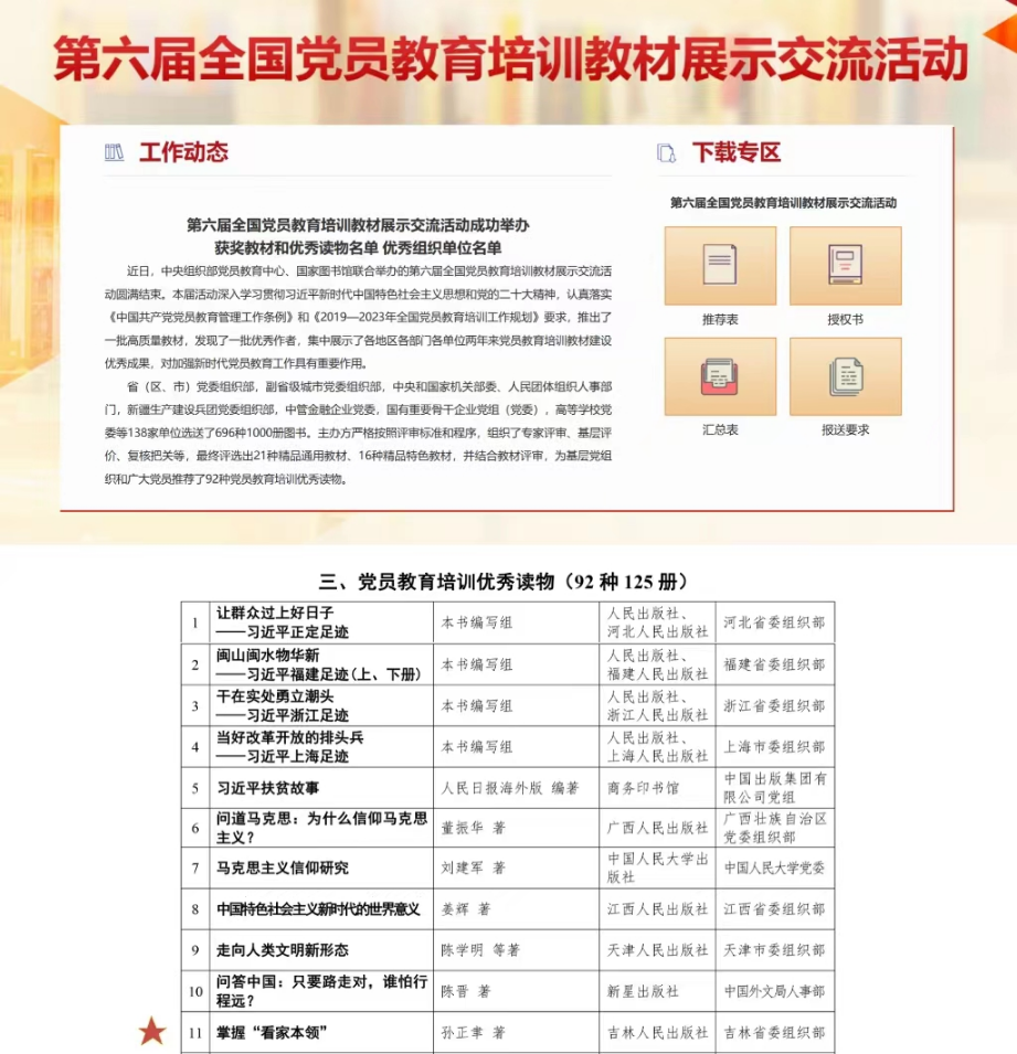 近日,中央组织部党员教育中心、国家图书馆联合举办的第六届全国党员教育培训教材展示交流活动圆满结束。本届活动深入学习贯彻习近平新时代中国特色社会主义思想和党的二十大精神,认真落实《中国共产党党员教育管理工作条例》和《2019—2023年全国党员教育培训工作规划》要求,推出了一批高质量教材,发现了一批优秀作者,集中展示了各地区各部门各单位两年来党员教育培训教材建设优秀成果,对加强新时代党员教育工作具有重要作用。