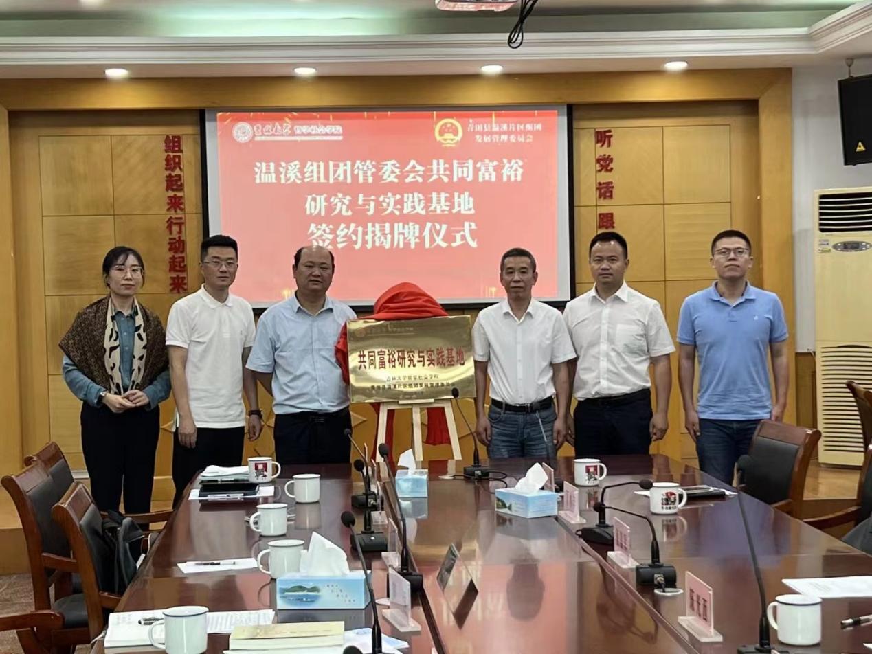 6月29日,学院与“青田县温溪片区组团发展管理委员会”(简称温溪组团管委会)共同签署合作备忘录,bv伟德国际1946官网“共同富裕研究与实践基地”正式落地温溪镇,双方将携手共同探索实现小城市发展带动周边乡村实现共同富裕发展路径。青田县委常委、温溪组团管委会主任、温溪镇党委书记童森军主持仪式。公司副经理芦恒教授、温溪组团管委会常务副主任陈光西分别代表双方签订基地合作备忘录。公司党委副书记兼副经理刘培强、温溪组团管委会主任童森军共同为共同富裕研究与实践基地揭牌。