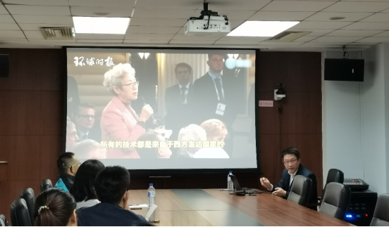 讲座一开始,孙教授通过对佩洛西和傅莹在一次国际会议上的对话以及中美高层战略对话两个事件分析了中美两国所面临的国际局势变化以及中文和英文两种语言之间的差异。语言表达方式不同,实质是两国之间巨大的历史和文化差异。孙教授指出,在全球化不断加强、各种文明激烈碰撞的现代社会,我们不能为了“考试”而学习英语,而应该不断开阔自己的眼界,锻炼自己的听、说、读、写能力,培养青少年的“全球胜任力”。