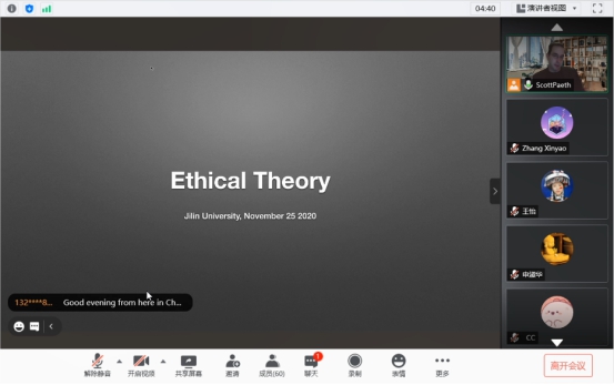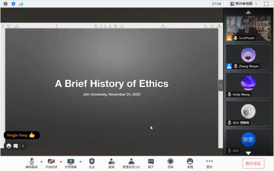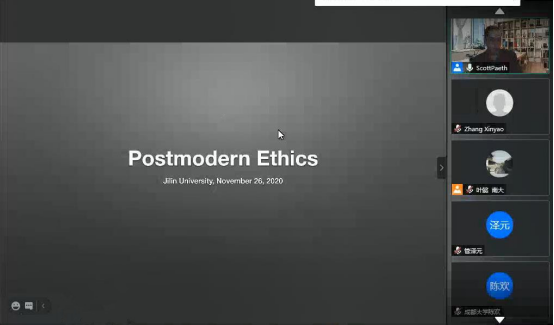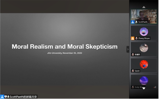 2020年11月24至27日晚21点,由bv伟德国际1946官网、bv伟德国际1946哲学基础理论研究中心主办并由美国德保罗大学Scott Paeth教授主讲的Moral Skepticism and Ethics系列讲座成功于线上举办。本系列讲座主要概述了道德认识论、元伦理学以及伦理学理论在生活道德经验中的应用。Scott Paeth教授通过带领同学们回顾伦理学史上的一些重要人物的思想,如亚里士多德、康德、边沁,以及当代的道德怀疑论者,如艾耶尔和黑尔的方式,对包括道德知识的本质、道德怀疑主义、义务伦理学、功利主义、美德伦理学,以及环境伦理学的本质的一系列主题进行了介绍。Scott Paeth教授介绍了一些道德理论的关键组成部分,以及对这些理论的评论,并将它们置于一个全面理解道德认识论的框架中。