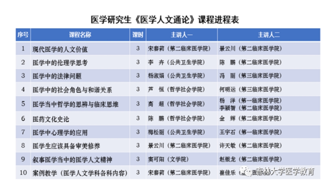 公司哲学系高超副教授、社会学系芦恒教授、陈鹏教授被纳入到跨学科团队之中,与第二临床医院和第三临床医院的临床医生一起分别开设《医学当中哲学的思辨与临床思维》《医学中的社会角色与和谐关系》《医药文化史论》等课程,并积极参加集体备课和教学过程。