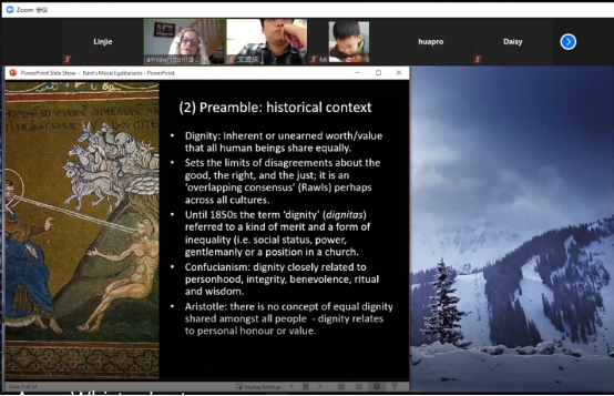 2020年11月11日19点,英国牛津大学讲师Amna Whiston博士通过Zoom平台为bv伟德国际1946官网师生开设线上讲座“康德的道德平等主义”(Kant’s Moral Egalitarianism)。院内外师生踊跃参与会议。
