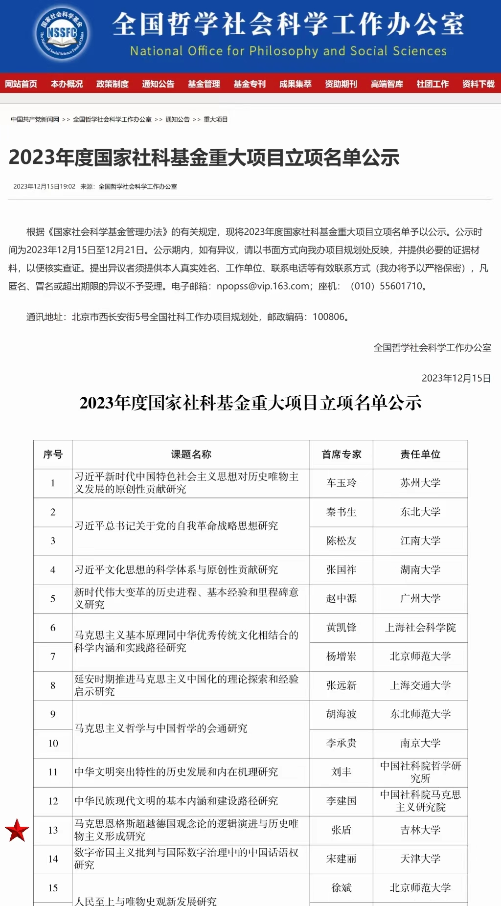 日前,根据全国哲学社会科学工作办公室发布的《2023年度国家社科基金重大项目立项名单公示》通知显示,公司张盾教授任首席专家的课题《马克思恩格斯超越德国观念论的逻辑演进与历史唯物主义形成研究》获得2023年度国家社科基金重大项目立项!