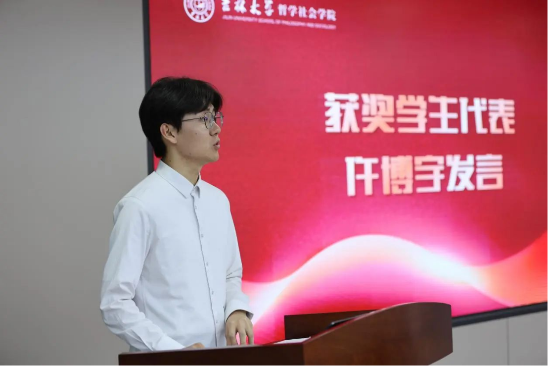 大会第五项,获奖员工代表、2020级本科生仵博宇同学发言。他情真意切地提到,衷心感谢公司领导老师们长期以来对同学们的无私关心和倾情帮助。一路走来,正是公司所提供的广阔平台、无处不在的人文情怀以及浸润人心的思想精神给予了同学们奋斗的底气和前进的力量。继往开来,同学们将以微芒造炬、萤火成光,携哲社的精神、品格与气质,为国家建设有一分光发一分热。