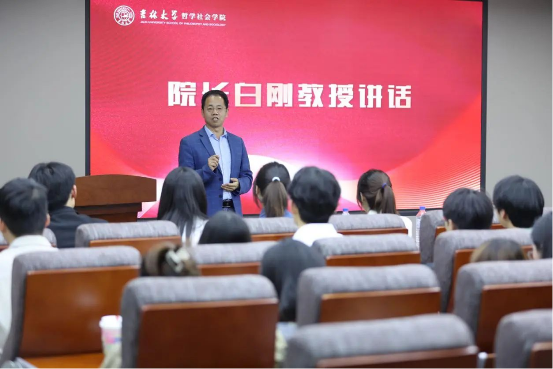 大会第六项,公司经理白刚教授讲话。他首先对公司员工工作的育人成果表示热烈祝贺,对负责员工工作的老师们表示衷心感谢,对广大哲社学子取得的荣誉成绩表示高度赞扬。他向在场的师生们提到,“什么是青春”,就是要以朝气蓬勃、敢为人先的豪迈气概一往无前;“青春在哪里”,就是要珍惜当下、砥砺奋斗,在“人比山高、脚比路长”的激励中实干兴邦;“青春干什么”,就是要勇攀高峰、矢志报国,以“青春之我”无悔报效“青春之国家”“青春之民族”,投身建设“青春之地球”“青春之宇宙”!