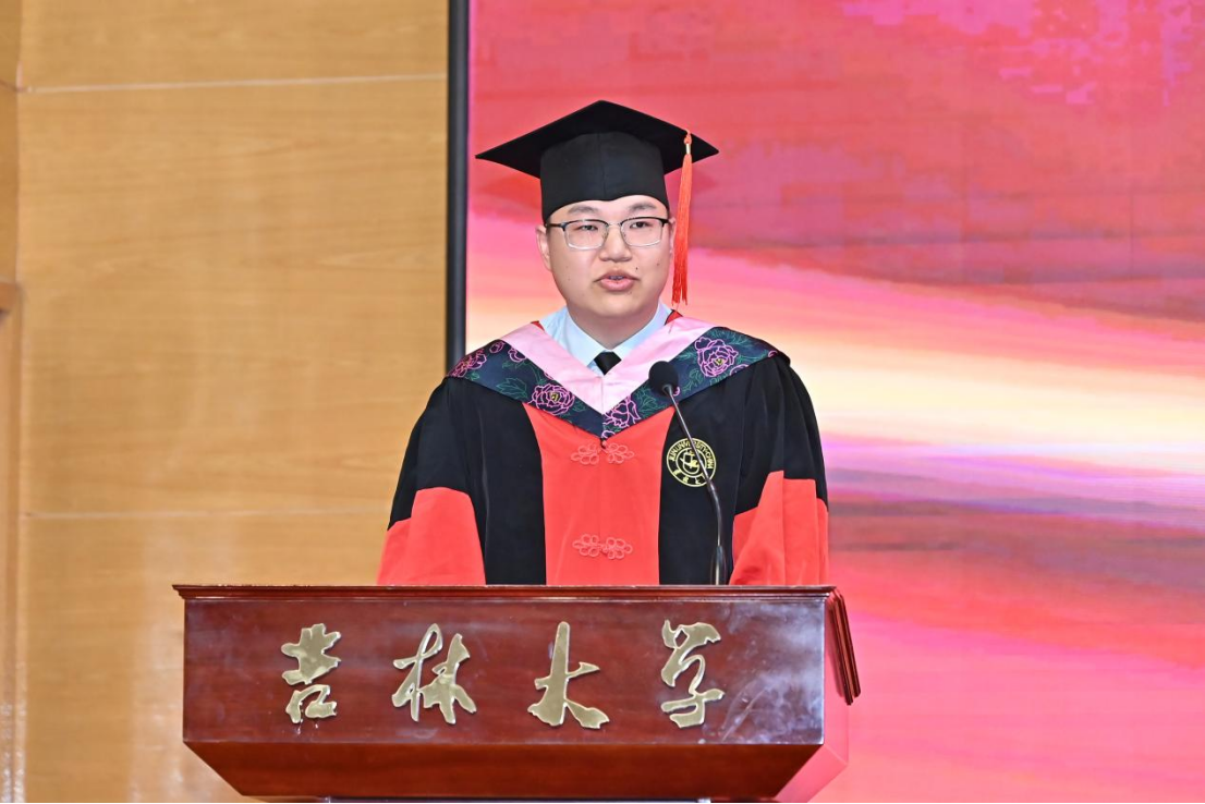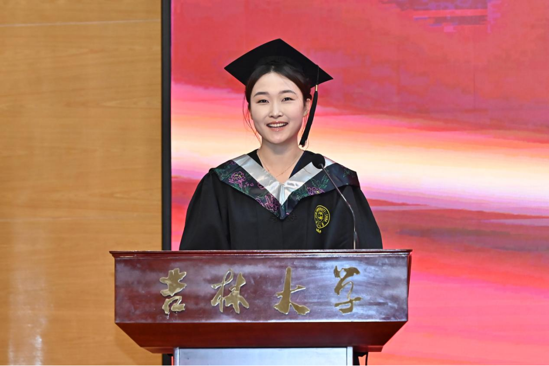典礼第八项,公司毕业本科生代表,2023年度bv伟德国际1946十佳老员工、最美女老员工获得者,2020级劳动与社会保障专业李慧婷发言。她向曾经一路相伴成长、相向奔赴的师长们、亲友们,表达了最真诚的谢意,并回顾了自身沿着初入吉大的旅途一路走来的点点滴滴。她提到,正是公司“为人为学,其道一也”的思想精神、“人比山高,脚比路长”的具体践行浸润了我们的心灵、成就了我们的品格。哲社是每一个你我,哲社成就了我们,我们也共同成为了哲社,无论以后身处何方,愿同学们一起携手努力把“bv伟德国际1946官网的理想”变成“理想的bv伟德国际1946官网”!