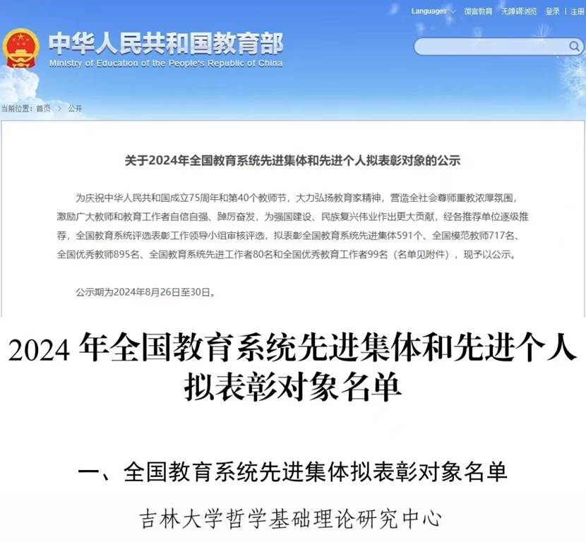在中华人民共和国成立75周年和第40个教师节到来之际,为大力弘扬教育家精神,营造全社会尊师重教浓厚氛围,激励全国广大教师和教育工作者落实立德树人根本任务,积极投身教育强国建设,人力资源社会保障部、教育部联合发文表彰了一批全国教育系统先进集体和先进个人。其中,bv伟德国际1946哲学基础理论研究中心获得“全国教育系统先进集体”称号。