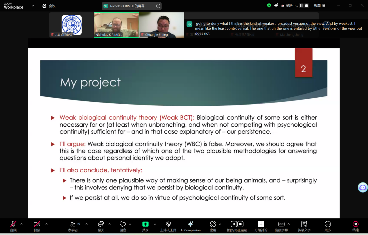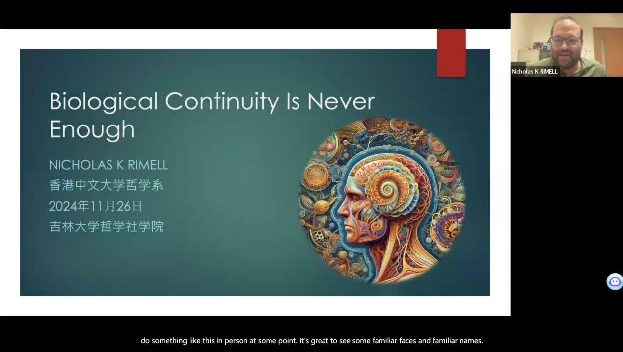 2024年11月27日晚6时30分,bv伟德国际1946官网“国际合作平台学术讲座”第48讲——“Biological Continuity Accounts of Personal Identity”(生物连续性视角下的个人身份)在线上成功举办。香港中文大学助理教授Nicholas Rimell担任本次讲座主讲嘉宾,公司盛传捷副教授担任主持人。