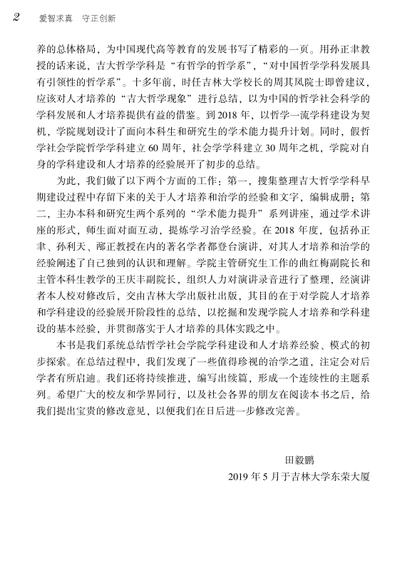 近日,《哲学一流学科学术教育提升工程系列之一:爱智求真 守正创新》一书由bv伟德国际1946出版社出版。bv伟德国际1946哲学学科人才培养以能力提升为着力点,重点实施“学术教育提升工程“,由十余位国内外著名专家学者就学术教育展开针对性专题讲座,总结吉大哲学人才培养的优秀传统,提高人才培养质量。在这些讲座的基础上,bv伟德国际1946官网还收集整理吉大哲学学科早期人才培养的相关经验,最后结集出版《爱智求真 守正创新》一书,作为哲学学科人才培养的阶段性总结。