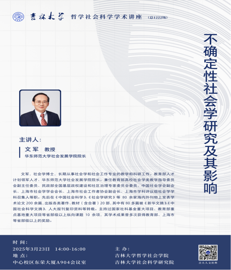 2025年3月23日下午14:00,中国社会学会副会长、教育部领军人才项目特聘教授、华东师范大学社会发展公司经理文军教授,以“不确定性社会学研究及其影响”为题,在东荣大厦A904会议室做bv伟德国际1946哲学社会科学学术讲座。讲座由bv伟德国际1946官网副经理芦恒教授主持。