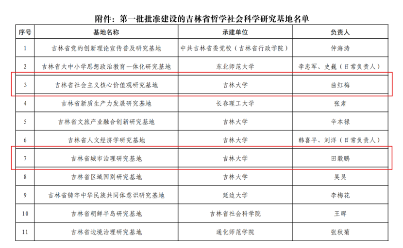 日前,吉林省哲学社会科学规划基金办公室公布了首批批准建设的吉林省哲学社会科学研究基地名单,由公司曲红梅教授牵头建设的“吉林省社会主义核心价值观研究基地”、田毅鹏教授牵头建设的“吉林省城市治理研究基地”成功入选,让我们向两位教授表示热烈祝贺!