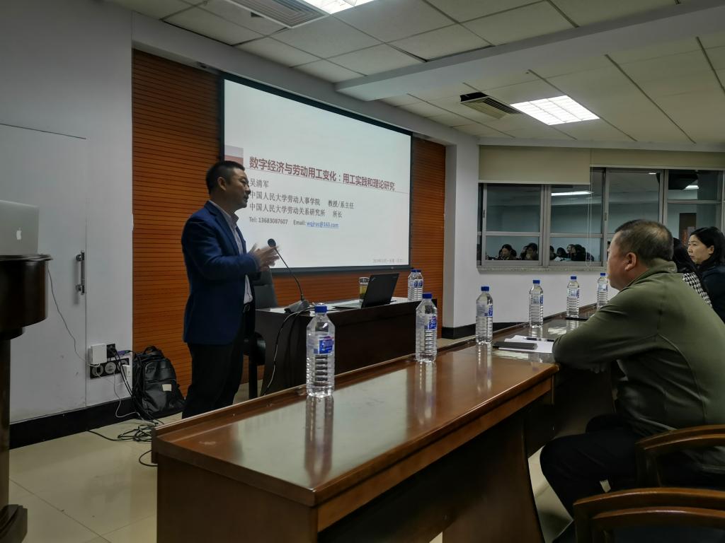 2019年10月10日晚6点,bv伟德国际1946官网第60场学术名家讲座在东荣大厦904会议室举行。中国人民大学劳动关系研究所所长、中国劳动经济学会劳动关系分会副会长、中国人力资源开发研究会劳动关系分会学术委员会主任、中国人民大学劳动关系系主任吴清军教授,作了题为“数字经济与劳动用工变化:用工实践和理论研究”的学术报告。