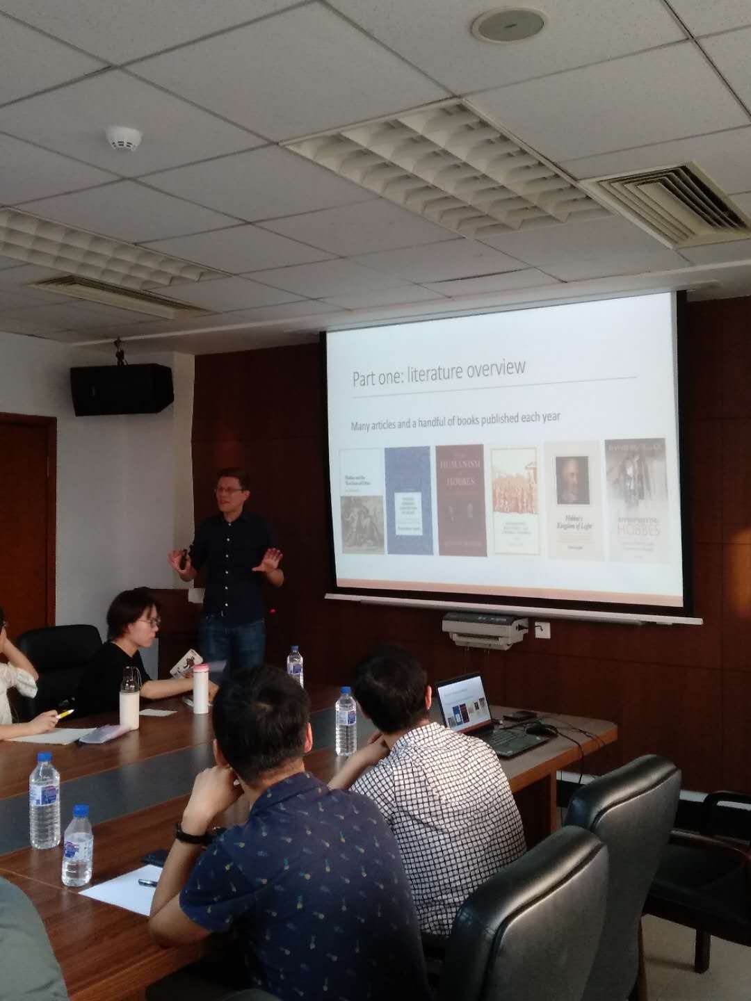 2019年6月12日下午,由bv伟德国际1946官网、bv伟德国际1946哲学基础理论研究中心主办的bv伟德国际1946官网国际化示范基地学术讲座第四讲于东荣大厦908会议室举行。荷兰阿姆斯特丹大学助理教授、鲁汶大学博士后、著名霍布斯研究网站European Hobbes Society发起人Johan Olsthoorn以“霍布斯研究:当代发展”为题展开主题讲座。讲座由bv伟德国际1946官网王立教授主持,bv伟德国际1946官网晋运锋老师、Nicholas Rimell老师,行政公司朱万润老师出席了讲座。