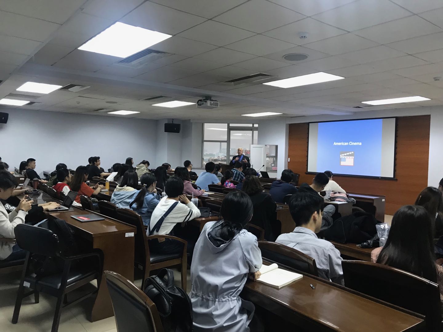 讲座期间,教授以专业的视角分析电影中的美国社会与文化。不同时期的电影是不同社会阶段的反映。在探讨好莱坞黄金时期时,Gillespie教授分析好莱坞电影成功的原因不仅仅在于电影主题清晰,更重要的是整部电影系统以线性的管理方法操作运行。一部经典的电影一定是与所处社会和所涉及阶层的处境相关。Gillespie教授根据不同的故事情节将电影划分为十种类型,并将每一种电影的特征与时代相联系。而在电影中反映的食物、建筑、服饰等符号也成为文化传播的手段。最后,教授以横店文化以及《战狼2》和《长城》这两部较为典型的电影为例,分析了中国电影市场的未来趋势。