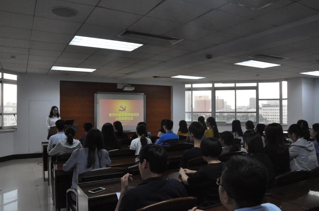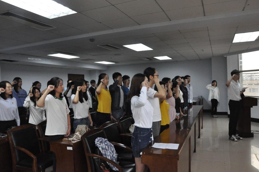 宣誓仪式在庄严肃穆的《国际歌》声中拉开了序幕。在激情豪迈的歌声之后,张俊峰老师宣读了参加入党宣誓的预备党员名单。随后,由姜昊良同志领读誓词,28名新党员紧握右拳,面对鲜艳的党旗庄严宣誓,表达了对党的忠诚和热爱。紧接着,预备党员代表谭聪同志发言,她表示宣誓仪式让自己受到了一次神圣的洗礼,这既是一名党员政治生命开始的象征,也是实现人生价值所做出的无悔选择的体现,更是党组织提出的更高的要求和希望,表示在今后的学习工作中用党员的标准严格要求自己,加强党性修养,改进自身缺点,用实际行动来践行今天的铮铮誓言。接下来,入党积极分子代表钟祥伟同学发言,表达了对为争取民族解放、国家富强的优秀共产党员的敬仰之情,对共产党员坚持的理想和所走的道路的自豪之情,同时也表示将更加坚定目标,不忘中国共产党人的初心,不断向身边优秀的党员学习,为将来成为一名合格党员而不断努力。在会议最后,赵洁老师代表党委讲话,表示了对新党员的由衷祝贺,同时也对已经确认身份的党员提出了要求,希望大家用实际行动塑造共产党员的形象,成为坚定理想信念的模范、主动获取知识的模范和做人的模范,无愧于共产党人的神圣称号。
