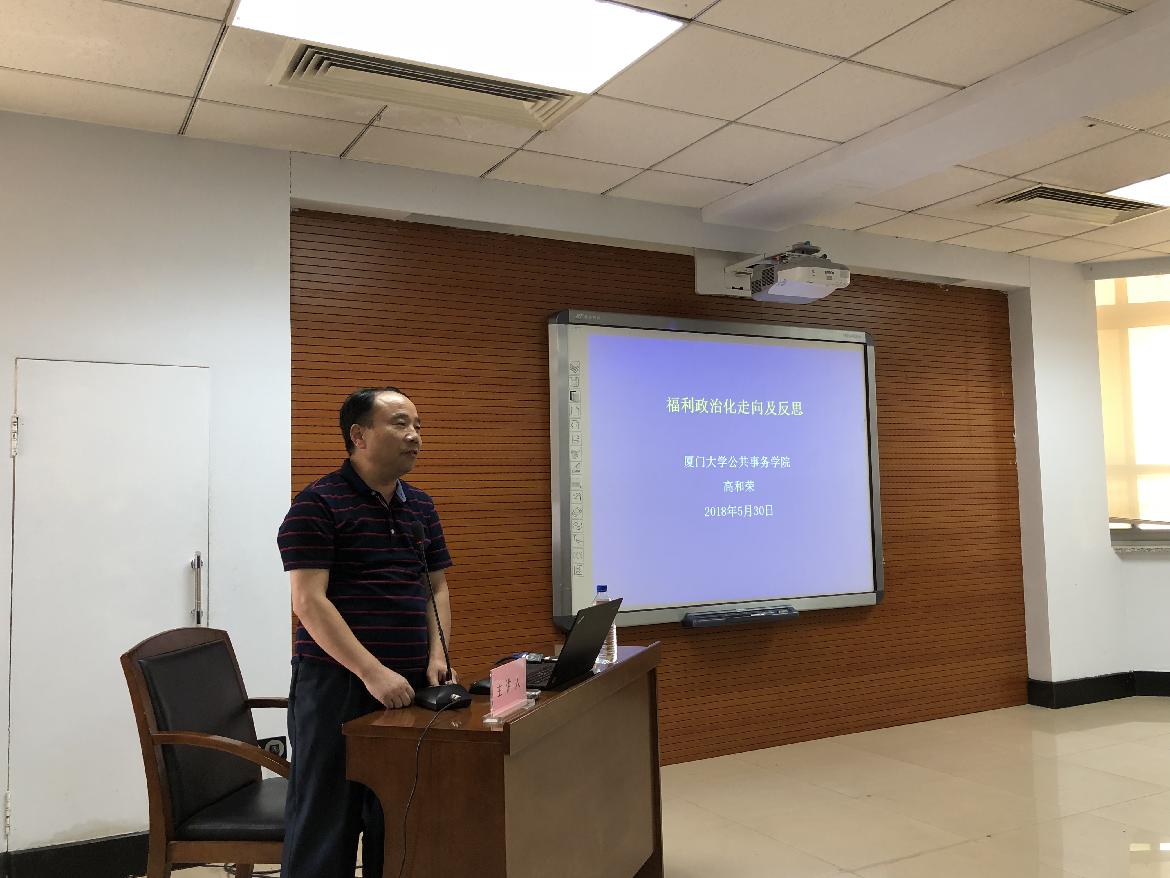2018年5月31日下午1点30分,厦门大学党校副董事长、中国社会学学会社会福利专业委员会副理事长、教育部新世纪优秀人才、福建省哲学社会科学领军人才、厦门大学公共事务公司博士生导师高和荣教授,在bv伟德国际1946东荣大厦九楼会议室做了题为“福利政治化走向及反思”的学术报告。本次讲座由bv伟德国际1946官网劳动与社会保障系系主任董才生教授主持。