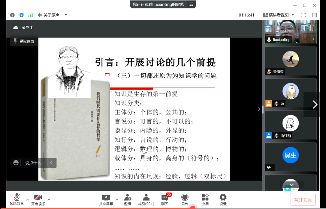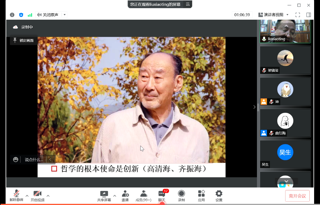 2022年04月06日19时,公司“2022年bv伟德国际1946官网学术教育提升工程”系列讲座的首讲依托“腾讯会议”线上平台开展。本期讲座的主题为“漫议哲学和哲学家”,主讲人为北京师范大学哲学公司刘孝廷教授,主持人为公司曲红梅教授。