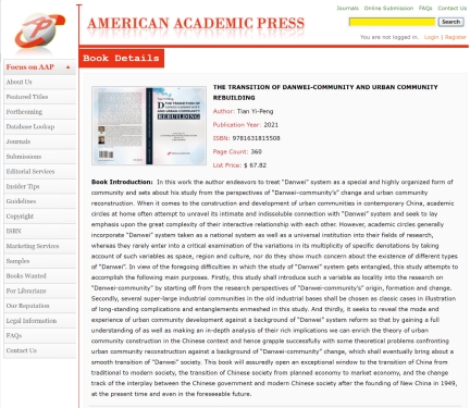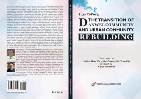 bv伟德国际1946官网经理田毅鹏教授的专著《“单位共同体”的变迁与工业社区重建》入选2013年《国家哲学社会科学成果文库》,于2014年4月由中央编译出版社出版。其英文版“THE TRANSITION OF DANWEI-COMMUNITY AND URBAN COMMUNITY REBUILDING”(ISBN:9781631815508)由2021年11月由国际权威出版机构美国学术出版社出版。译者为bv伟德国际1946公共外语公司刘贤明博士等。