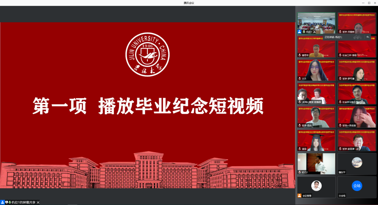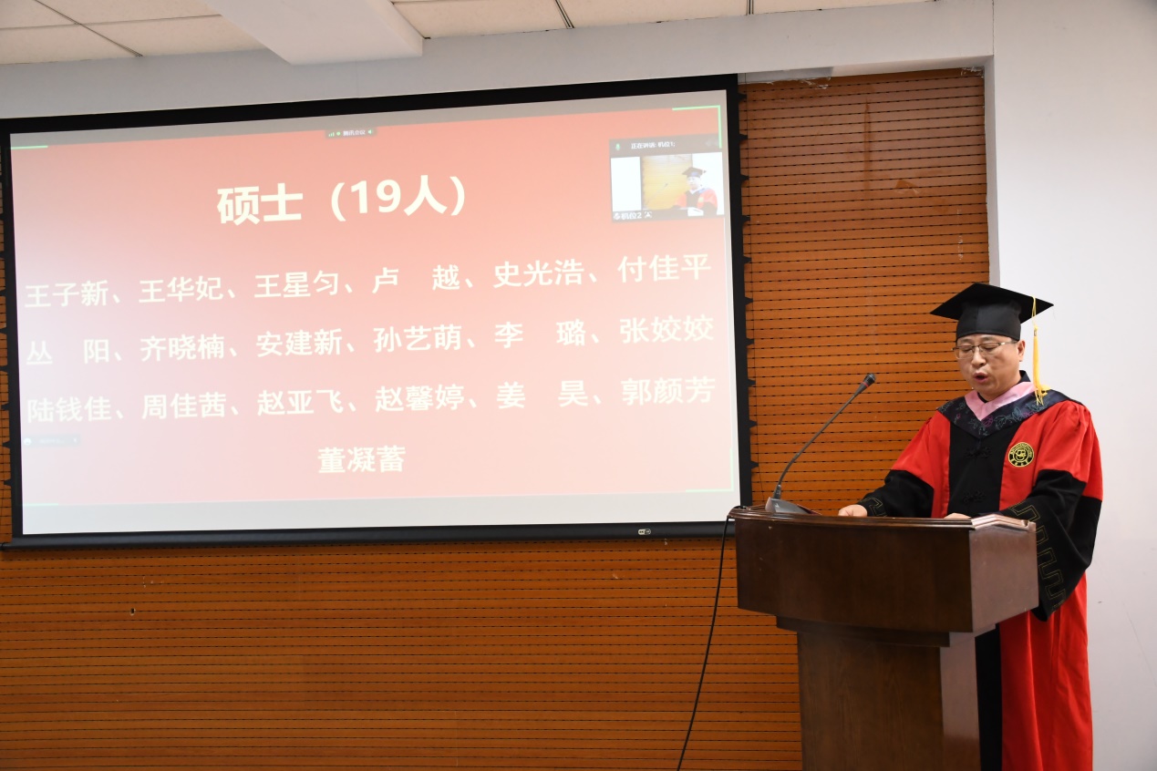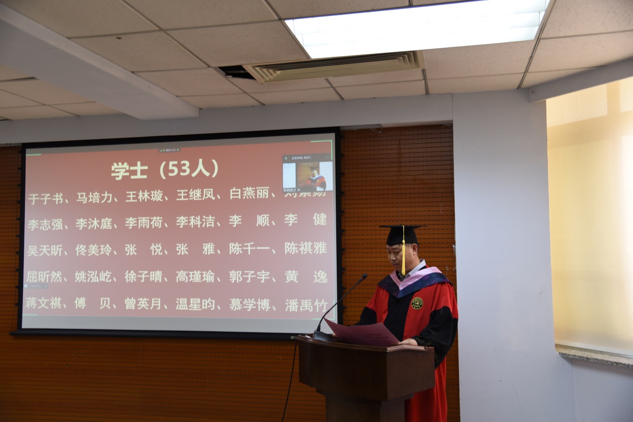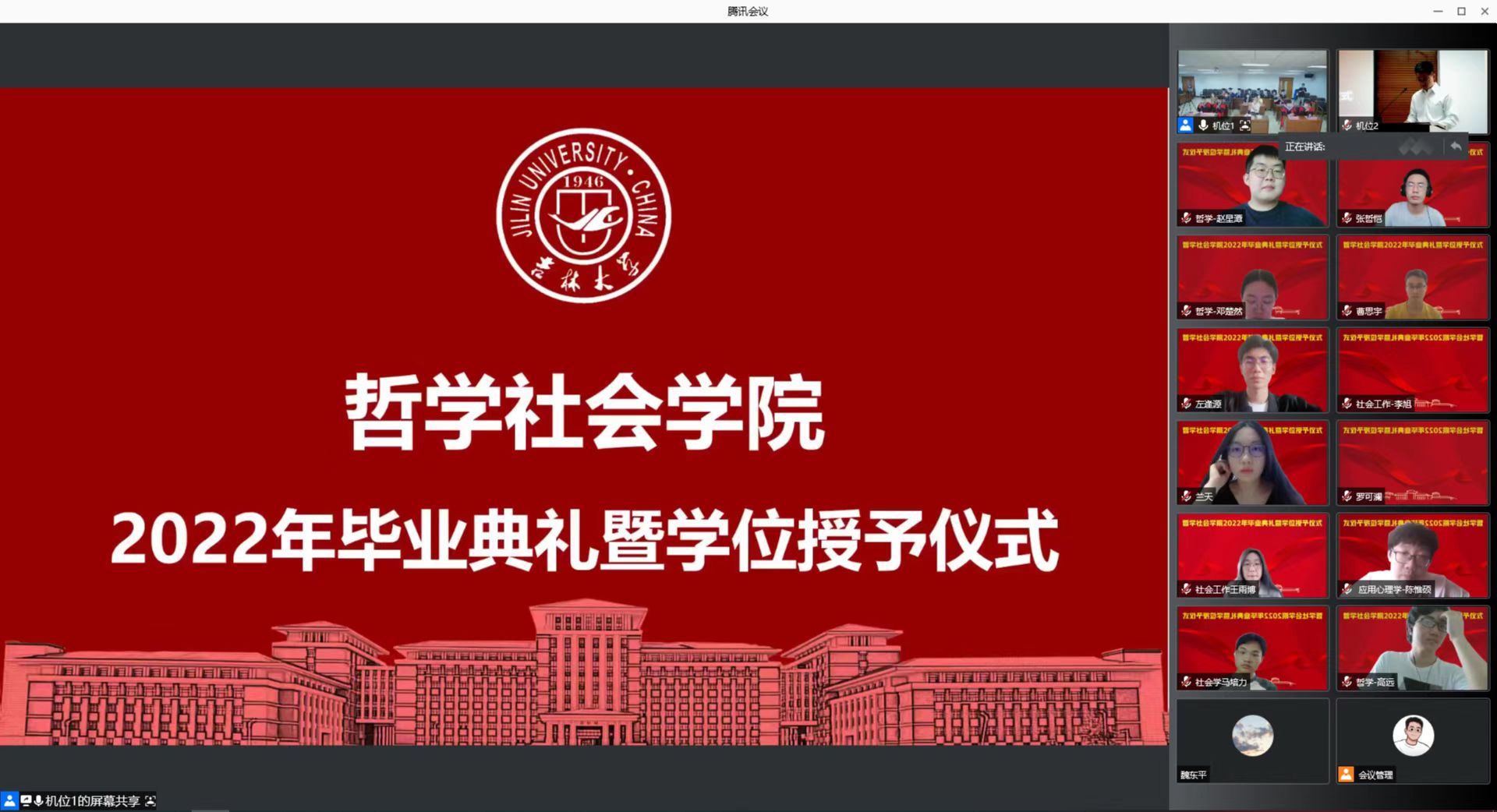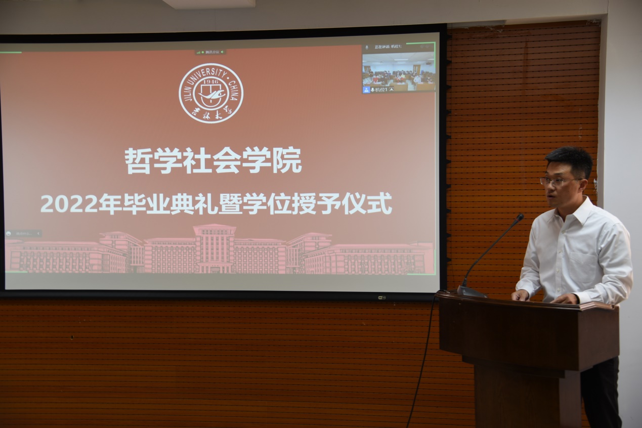 bv伟德国际1946官网经理田毅鹏、党委副书记赵洁、党委副书记兼副经理刘培强、副经理曲红梅、副经理芦恒、副经理王福生、哲学系副系主任高超、社会学系主任董运生、心理学系主任张彦彦、劳动与社会保障系主任董才生、公司教师代表社会学系教工党支部书记吴海琳,以及部分毕业生代表现场参加了典礼。同时,部分教师、全体毕业生通过线上会议的方式参加了典礼。典礼由公司党委副书记兼副经理刘培强主持。