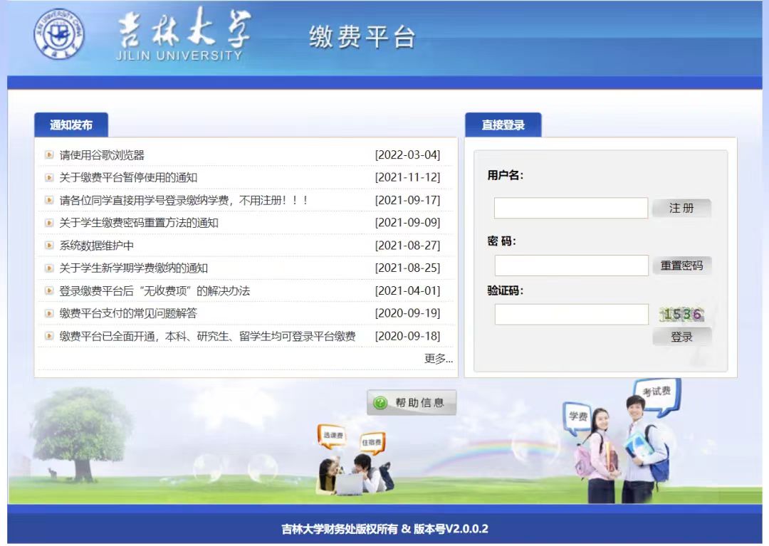 员工通过录入用户名(学号)、密码、验证码进入bv伟德国际1946缴费平台页面。
