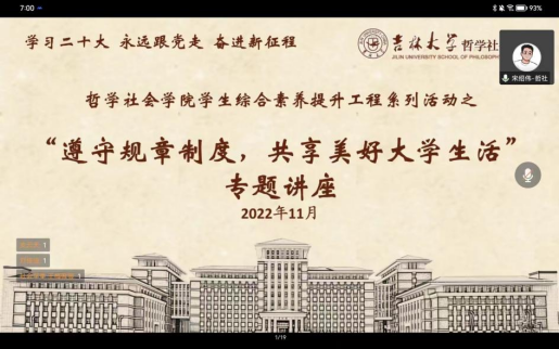 首先,姜宇航老师以“遵守规章制度,共享美好老员工活”为题,以丰富详实的案例,向同学们宣讲了校园生活中可能存在的违规违纪事件类别,并就典型事件向同学们做出警示。姜老师提醒同学们要严格遵守校规校纪,在纷繁复杂的社会生活中辨析是非,做到既守住“底线”,又不触碰“红线”,享受美好的老员工活,追逐光明前程。