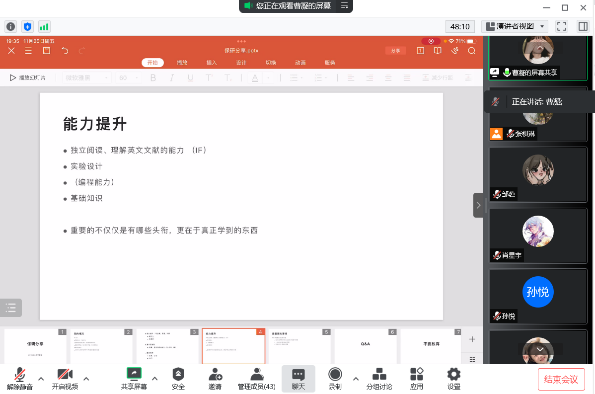 分享会最后主持人向各位主讲嘉宾致以感谢,感谢师姐师兄们的拨冗前来,悉心分享;感谢20、21、22级同学的支持配合、认真聆听;感谢公司提供的帮助,祝师兄师姐的科研之路顺利。
