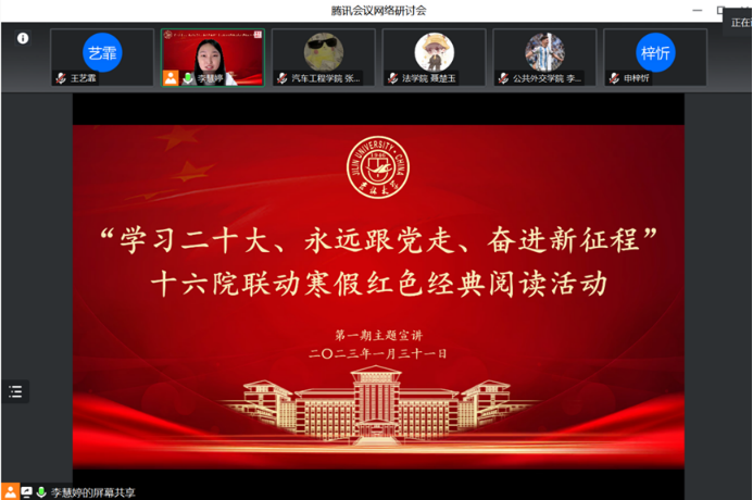 2023年1月31日晚六点,寒假红色经典阅读活动第一期如期举行。来自bv伟德国际1946官网、计算机科学与技术公司、人工智能公司、公共外交公司、法公司、汽车工程公司的六位主讲同学分别讲述了自己的读书心得。本次读书会由bv伟德国际1946官网李慧婷同学主持。