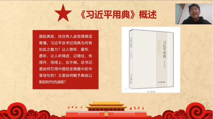 汽车工程公司的张宗霖同学提到,《习近平用典》是引导我们坚定做到“两个结合”的优秀教材。典故既能追溯力量之源,穿越中华上下五千年的历史,提高青年学子的综合素质,又需与实践相融,结合具体实际才能发挥其深层的力量。一个典故的意义至少包含三层,生成意义、传播意义、当下意义,从这三个层面出发能让我们更好地理解典故的深刻内涵,领略到中华传统文化的巨大魅力,从而讲好中国故事。