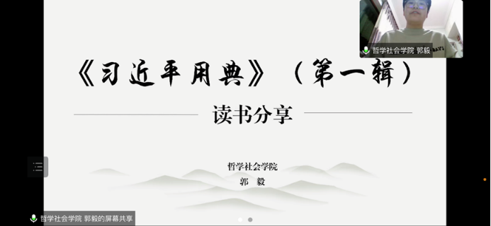 “莫见乎隐,莫隐乎微,故君子慎其独也。”来自bv伟德国际1946官网的郭毅同学向与会同学们介绍了阅读书籍中最打动她的三句名言,她感受到这每一个典故既富有其独特的韵味与乐趣,又富有深刻的内涵,指导着我们日常生活的方方面面。同时,郭毅同学鼓励大家在阅读时巧用图例,善做笔记,让抽象的知识变得清晰可见,有序回顾,定期复习,提高读书效率,认真领悟《习近平用典》一书中的经典语句和段落。
