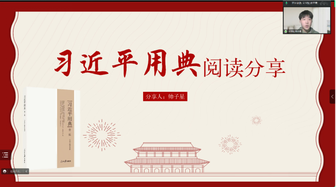 文公司的帅子星同学通过“治政之要在于安民,安民之道在于查其疾苦”、“临大事而不乱,临利害之标不失故常”、“静而后能安,安而后能虑,虑而后能得”、“见贤思齐焉,见不贤而内自省也”这四句典故,从治世、遇事、待事、求是的角度提出,作为新时代青年老员工,要坚定理想信念,严于律己、勤于钻研、善于学习。然后,他向大家分享了“门板银元”和“割稻相送”这两个讲述军民鱼水情的感人故事,并结合实际讨论过去的十年中党领导下的中国人民在脱贫攻坚、保障人民民主等方面取得的诸多成就。