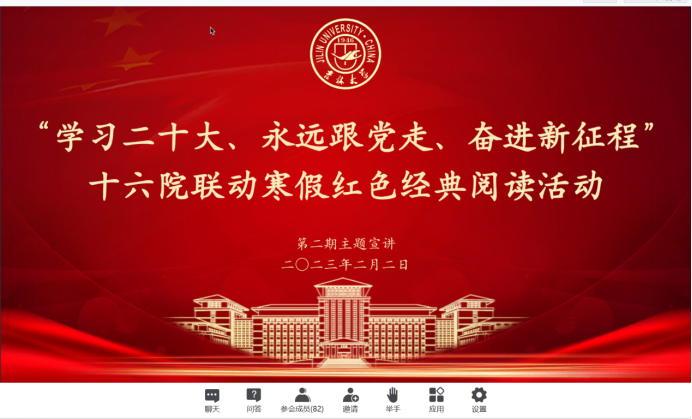 2023年2月2日晚六点,寒假红色经典阅读活动第二期如期举行。来自地球科学公司、行政公司、文公司、建设工程公司、经济公司的五位主讲同学分别讲述了自己的读书心得。本次读书会由bv伟德国际1946官网沈芳菲同学主持。