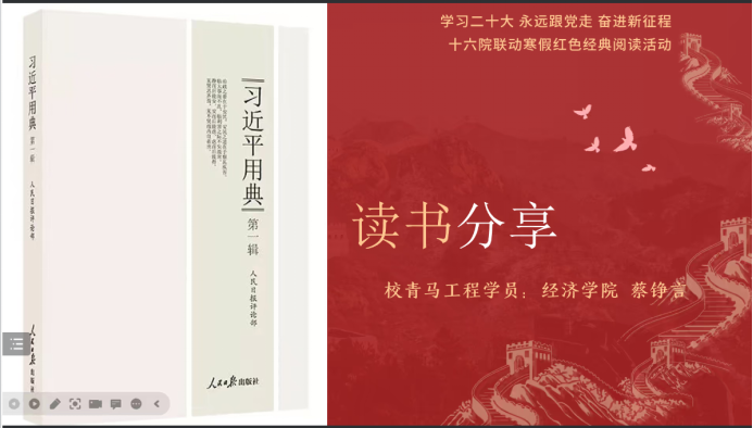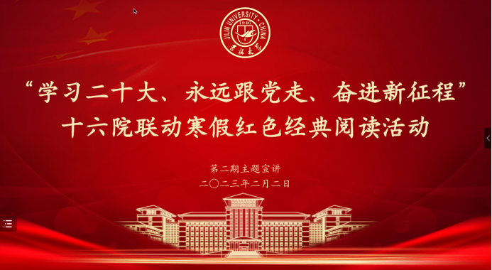 阅读经典,有助于我们客观清醒地学习中华优秀传统文化和社会主义先进文化,细致深刻地感悟党领导人民过去五年的工作和新时代十年的伟大变革,做到明理增信、崇德力行。在五位主讲同学和参会同学们的热情交流中,第二期寒假红色经典阅读活动圆满结束!