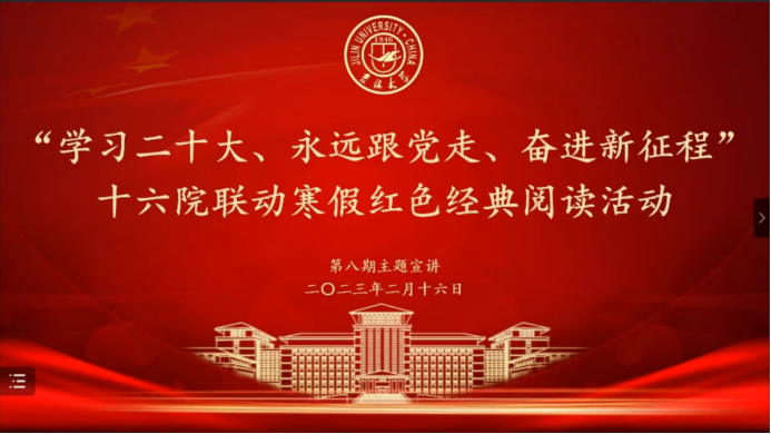阅读经典,有助于我们客观清醒地学习中华优秀传统文化和社会主义先进文化,细致深刻地感悟党领导人民过去五年的工作和新时代十年的伟大变革,做到明理增信、崇德力行。在五位主讲同学和参会同学们的热情交流中,第八期寒假红色经典阅读活动圆满结束。