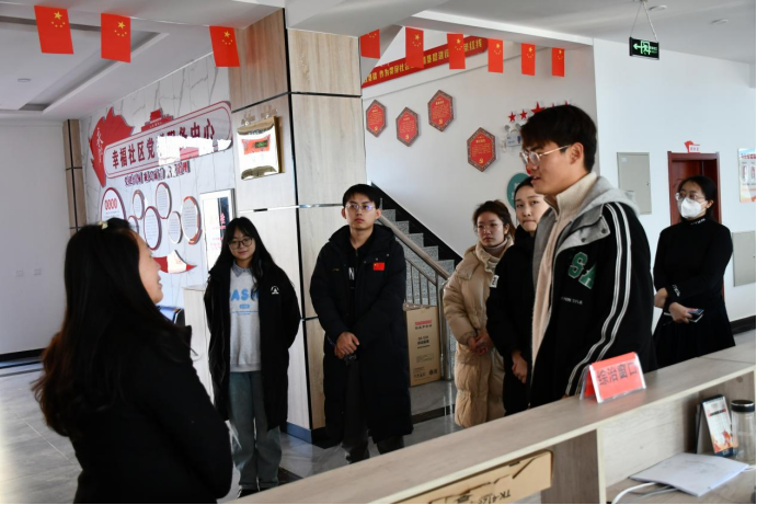 二队同学前往通榆县树满街道幸福社区,在社区书记代立娟、社区副书记刘思嘉的带领下参观党群服务中心,并就即将开展的社会实践与志愿服务进行对接。综合考虑幸福社区实际情况与“北辰”社会实践团队人员构成等要素,提出了未来活动的相关规划。