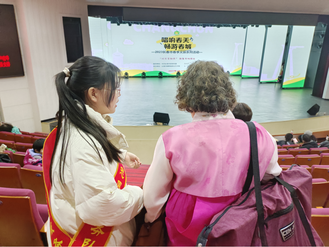 下午四时许,志愿者们在长春市朝鲜族群众艺术馆前集合。在分工完工作后,同学们走向各自岗位值守开始今天的志愿活动。同学们在从艺术馆门口到三楼演出厅的路线上,一些同学在入口处负责为观众进行检票,提醒观众戴好口罩;一些同学负责指引路线,引导群众前往展演厅;一些同学负责维持演出的现场秩序,使演出能够正常开展。志愿者们认真负责、坚守岗位,为本次群众性文艺演出保驾护航。