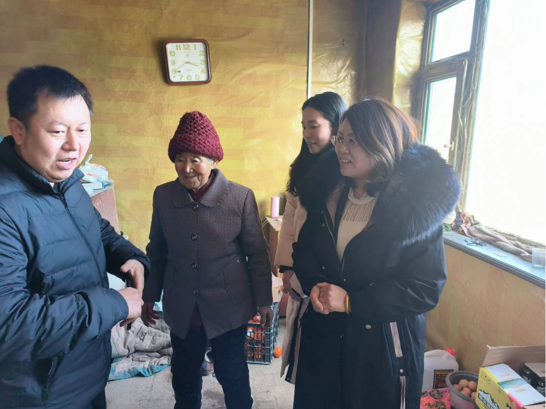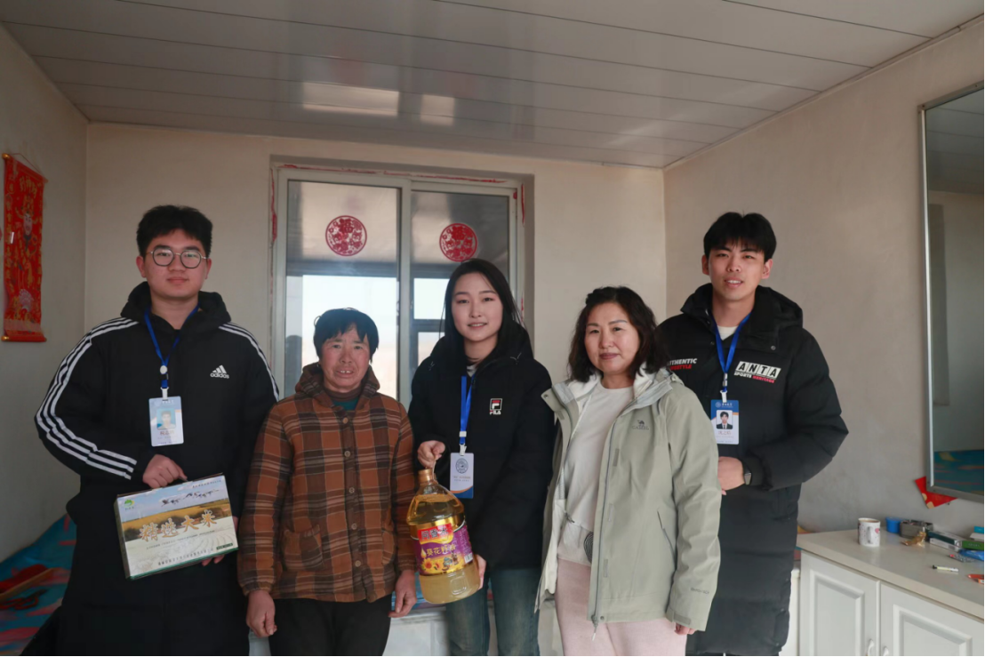 紧接着,实践团队来到通榆县包拉温都蒙古族乡半拉格森村,走进农户家中炕头,进行慰问。一行人先后前往多户脱贫村民家中,与村民进行面对面访谈交流,深入了解十年来脱贫攻坚为村民生活带来的巨大变化以及村民对于未来美好生活的展望,并送去大米、食用油、水果等生活用品。在交流过程中,团队成员向村民了解了有关作物收成、居住条件等方面的情况,并介绍与普及了科技小院对于作物增产的重要作用。
