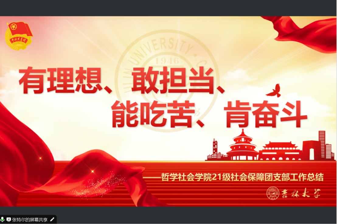 公司2021级4班团支部书记张特尔,以“有理想、敢担当、能吃苦、肯奋斗”为主题,围绕团的组织建设、团的思想教育、团的组织活动三个方面进行了汇报答辩,并表达了对未来团支部建设的期待。