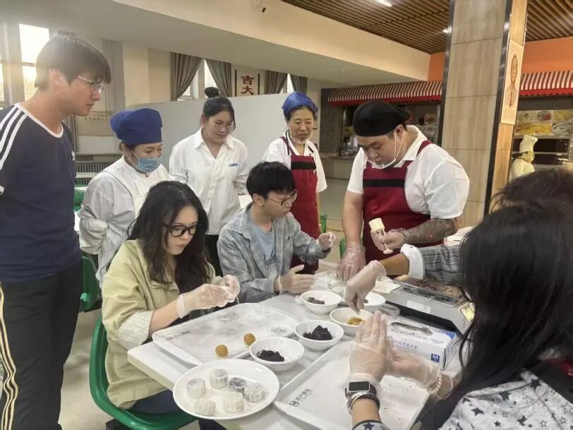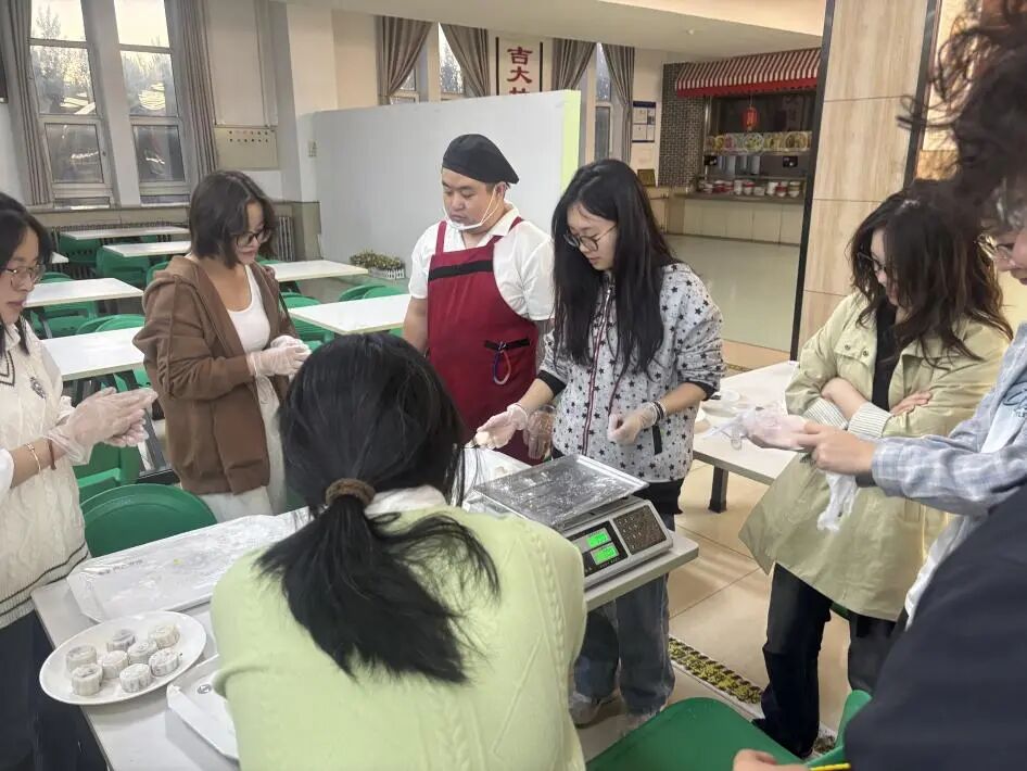 手工制月饼,品味传统食韵。“月饼寄相思,巧手蕴温情”,手工制月饼环节将中秋饮食文化与实践体验深度融合。公司特邀湖畔食堂面点师傅现场教学,从冰皮的揉制技巧、馅料的搭配比例,到模具压花的细致手法,师傅一一耐心演示,将传统月饼制作技艺倾囊相授。同学们自由分组围坐,在揉、捏、包、压的过程中,慢慢掌握传统手艺的精髓。原本略显生涩的动作逐渐熟练,一个个花纹清晰、形态精致的冰皮月饼接连成型,香甜的气息在空气中弥漫。这不仅是一次手工实践,更是对“中秋食月”传统习俗的鲜活传承,让同学们在亲手制作中品味传统美食背后的文化寓意,收获“自己动手,丰衣足食”的满满成就感。