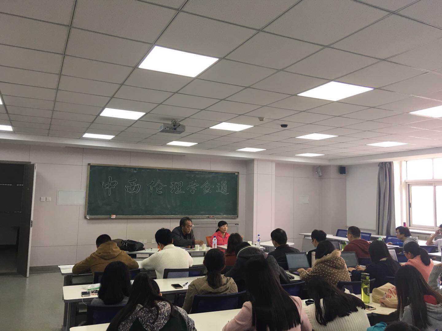 为拓宽同学们的学术视野,给同学们提供一个与哲学名师交流思想的机会,由bv伟德国际1946官网员工会学习部主办的名师讲座于10月28日上午九时三十分在第三教学楼313教室成功举行。讲坛采取新颖的对话形式,以中国传统伦理思想与伦理学、西方伦理学之间典范的差异与会通为题,邀请了分属这两个研究领域的哲学系教授刘连朋老师和曲红梅老师作为主讲进行分析,同时参与活动的还有来自多个专业的同学们。