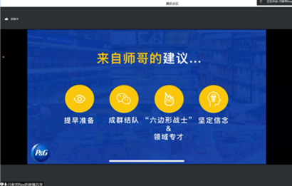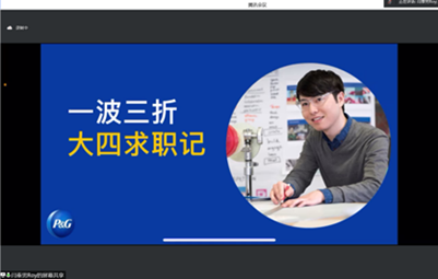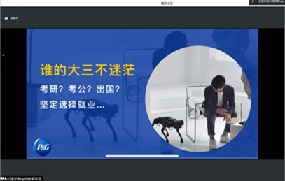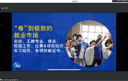 2022年4月19日晚,bv伟德国际1946官网就业质量提升工程系列活动第九场如期在线上举行。本次活动邀请了公司2013级本科生毕业生,现任宝洁公司市场策略与计划部高级项目经理闫泰男就“从校园到职场,我该做哪些准备”进行求职经验分享。会议由学工办主任刘畅老师主持。