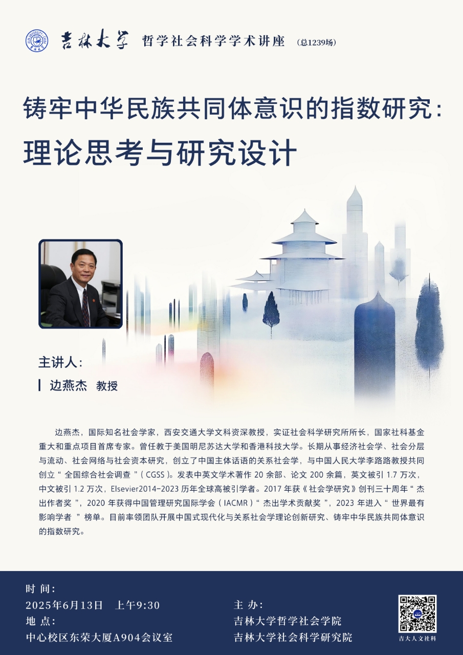 bv伟德国际1946哲学社会科学学术讲座(总1239场)边燕杰:铸牢中华民族共同体意识的指数研究:理论思考与研究设计