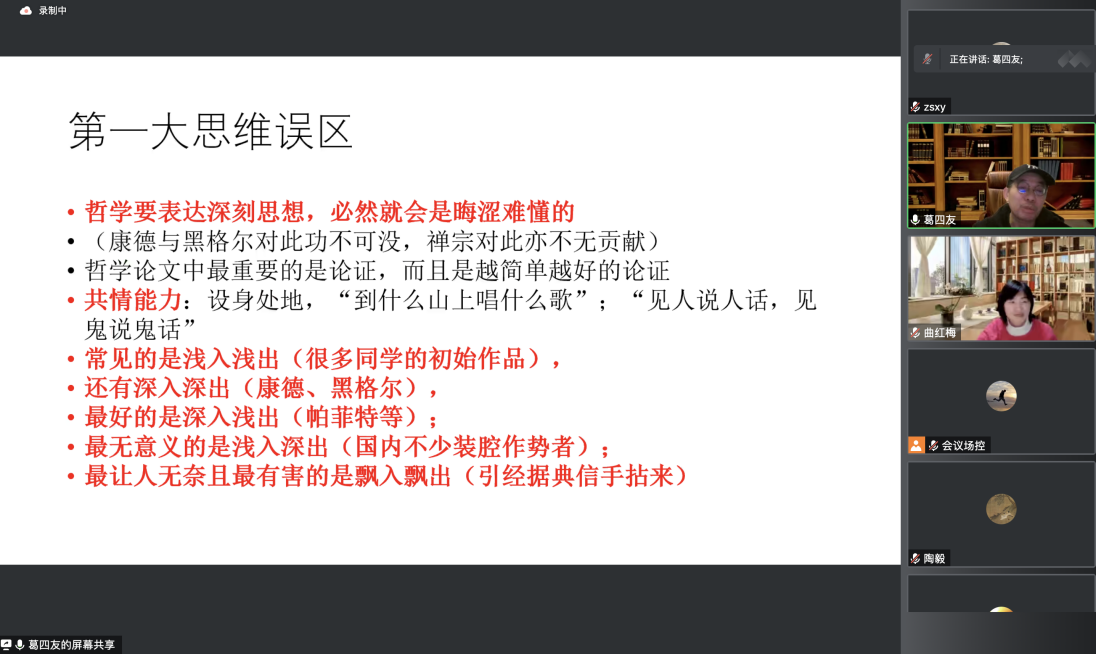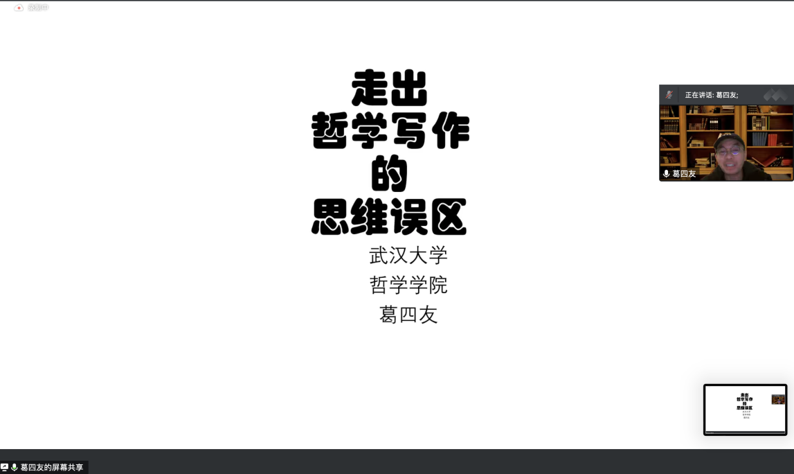 2022年12月5日晚7点,“bv伟德国际1946官网教育提升工程系列讲座第八讲”在线上顺利召开。本期讲座的主题为“走出哲学写作的思维误区”,主讲人为武汉大学哲学公司葛四友教授,主持人为公司曲红梅教授。讲座吸引了近三百名师生在线参与。