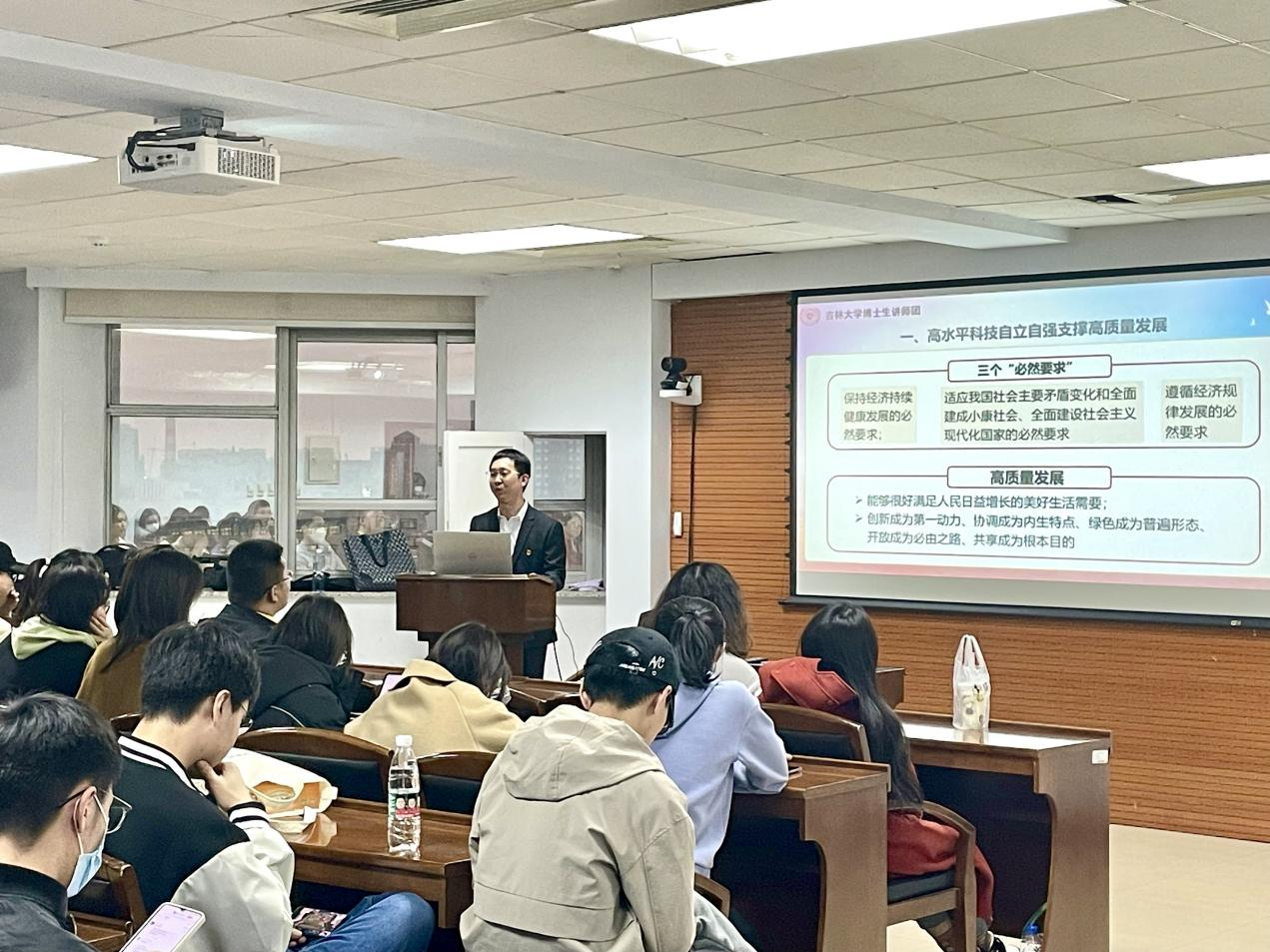 为充分发挥博士生讲师团理论宣讲作用,引领广大青年学子学深悟透党的新理念、新思想、新战略和全国两会精神,2023年4月27日18:00,bv伟德国际1946博士生讲师团讲师蒋理走进bv伟德国际1946官网开展理论宣讲。本次宣讲的主题是“凝聚精神力量 激发使命担当”——以科技创新赋能,推动高质量发展。研究生各党支部党员、中共预备党员、德育助管、研究生干部参与本次活动。
