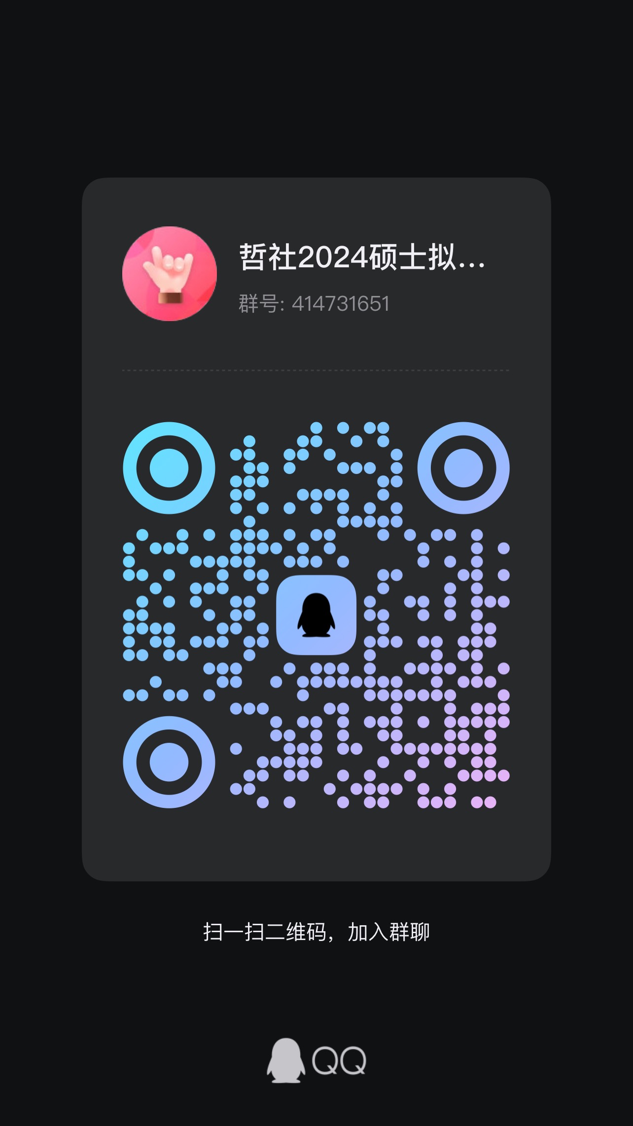 请拟录取考生尽快加入硕士拟录取QQ群414731651(二维码见下方图片),入群申请为“姓名-报考专业-身份证后四位”,后续调档、录取等相关通知将在QQ群内发布(不在公司主页发布,望周知!),请拟录取考生务必于2024年4月7日上午10:00前入群,并及时查看群内通知。