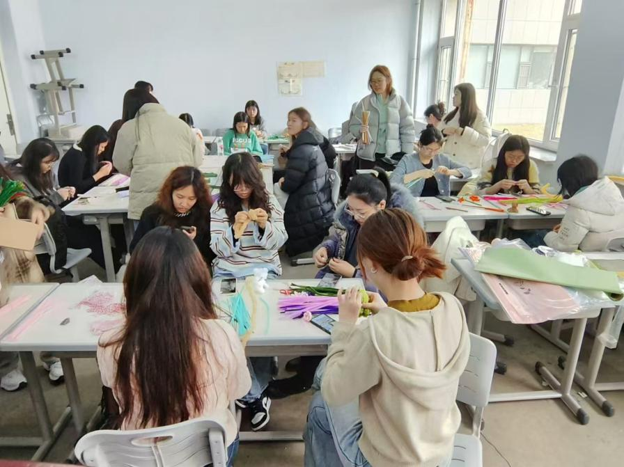 活动伊始,主持人向同学们介绍了扭扭棒手工制作的心理疗愈原理,通过手部操作的重复性动作,参与者能够逐渐进入冥想状态,从而释放内在的焦虑与紧张。随后,同学们自行分组并挑选心仪的手工材料,与同伴一起沉浸在创作的乐趣中,通过细腻的编织手法展现内心的宁静,现场氛围轻松愉快。